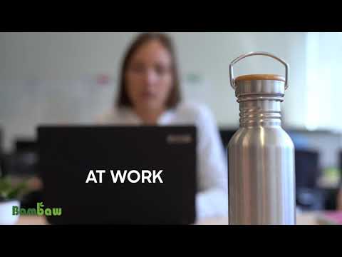 The stainless-steel water bottle from Bambaw has a sleek and elegant stainless-steel design. The BPA-free water bottle is free of any paint, ensuring scratch resistance. The unique design is topped off with a bamboo lid. The neutral design makes the reusable water bottle ideal for work, hiking, yoga, traveling and all everyday activities.