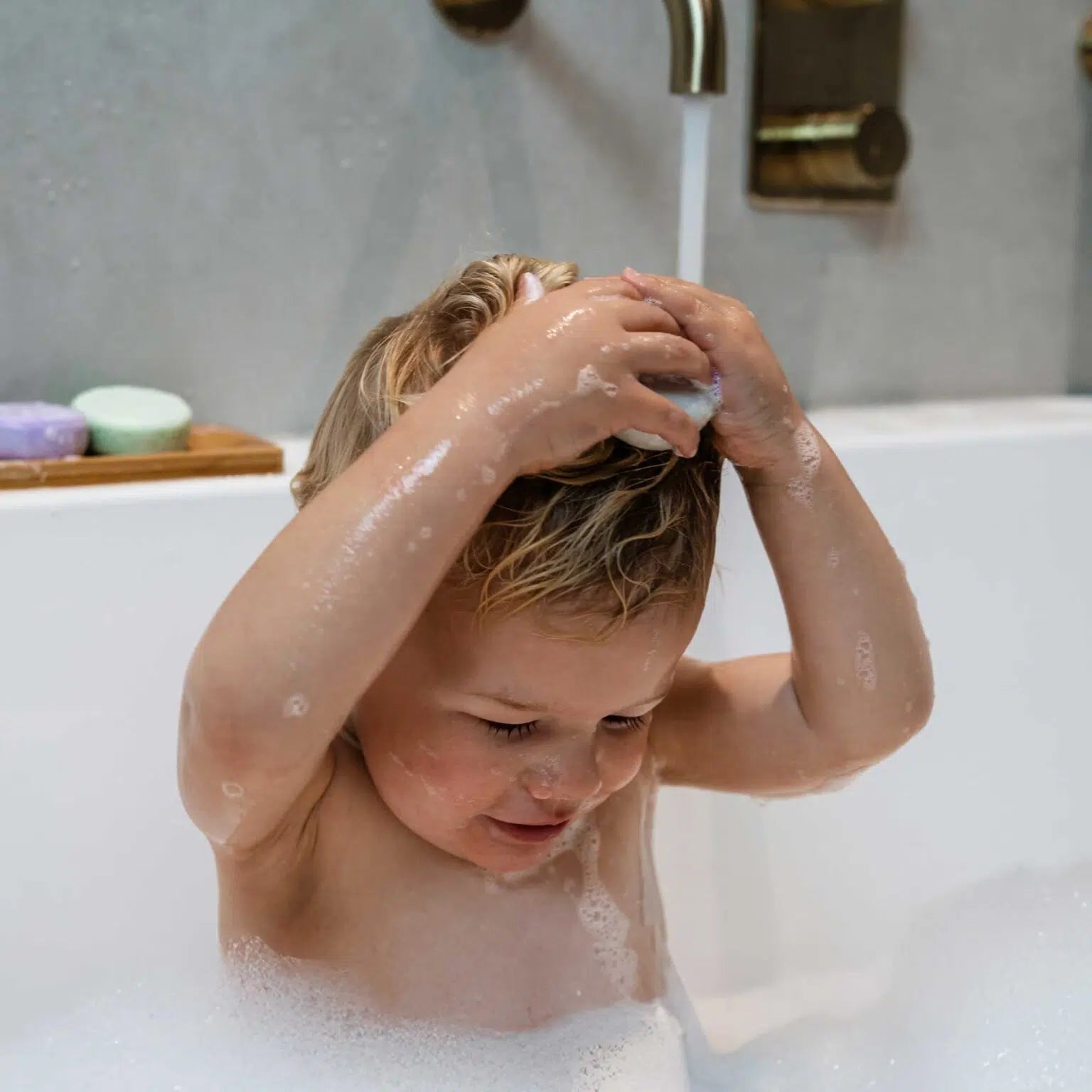 Maak de bar nat en wrijf hem tussen de handen om schuim te creëren. Masseer het schuim zachtjes over het haar, de huid en het gezicht. Spoel daarna goed uit. Je kunt de bar ook direct over huid en haar wrijven voor nog meer gemak. Tip: bescherm de oogjes met je hand.